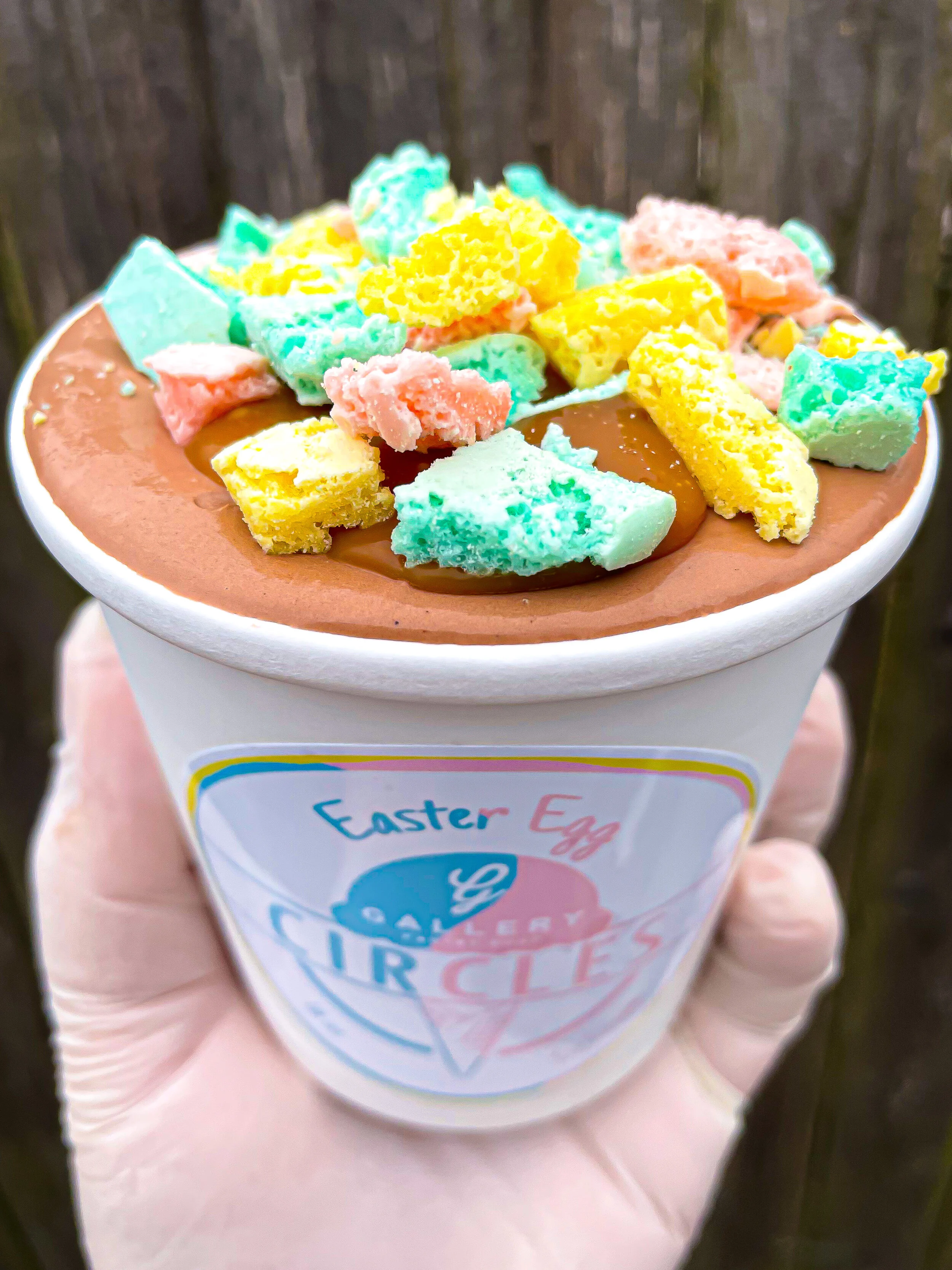 We teamed up with Gallery Pastry Shop to create an Easter Egg ice cream! Chocolate ice cream oozing with salted caramel and speckled with Gallery Pastry Shop’s macaron shells.